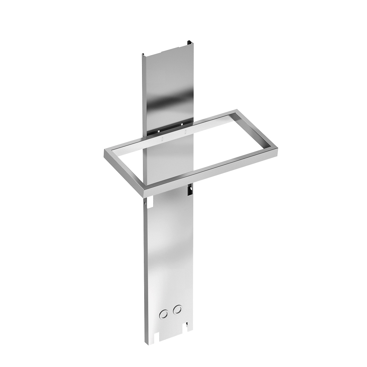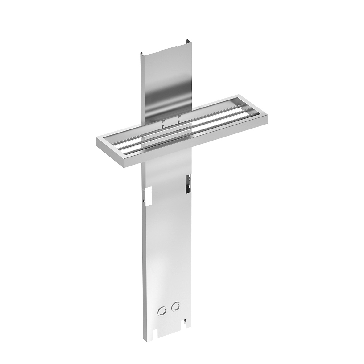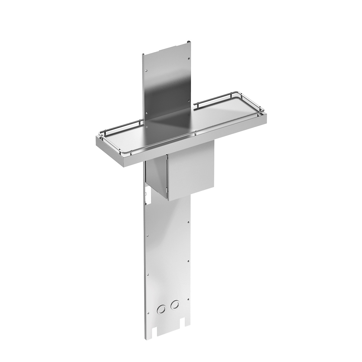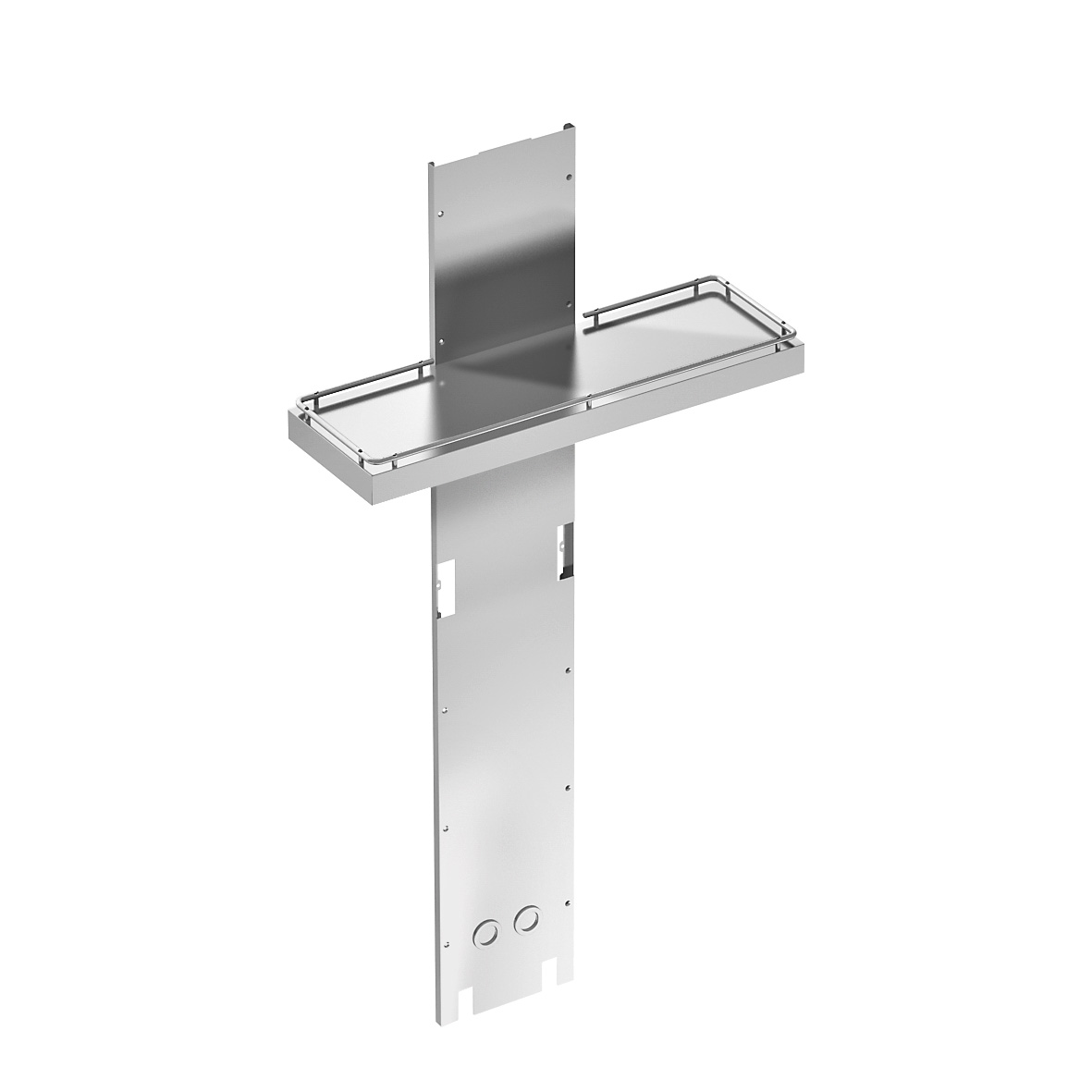 Double front upright with structure made in tubular AISI 304 stainless steel structure, cover made of AISI 304 stainless steel plate, satin finish. Pre-arranged for fixing to floor and to appliance. Two levels ccan be equipped. Delivered on the upper level: 2 shelves. If the lower level has NOT accessory, upright must be completed with cover.