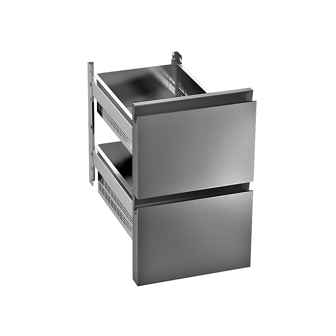 One-piece structure made in special anti-fingerprint steel. CFC-free polyurethane insulation, 60 mm thick. Easy removable AISI 304 stainless steel rack bars. Automatic defrosting system by air. Automatic condensation evaporation. Supplied as standard each compartment: 2 AISI 304 stainless steel runners + 1 shelf. Digital thermometer-thermostat. Without top. 1 door, 2 drawers.