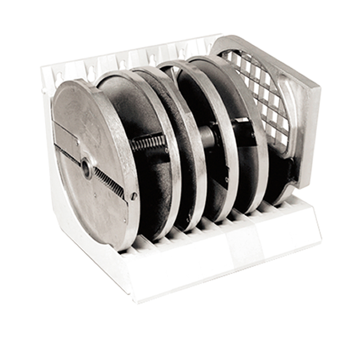 Estructura y basamento de aluminio anodizado. Palanca y árbol discos en acero inox 18-10.Motor monofásico. 1 velocidad. Equipado de cubeta de recojida en acero inox, grada y pala expulsor.
