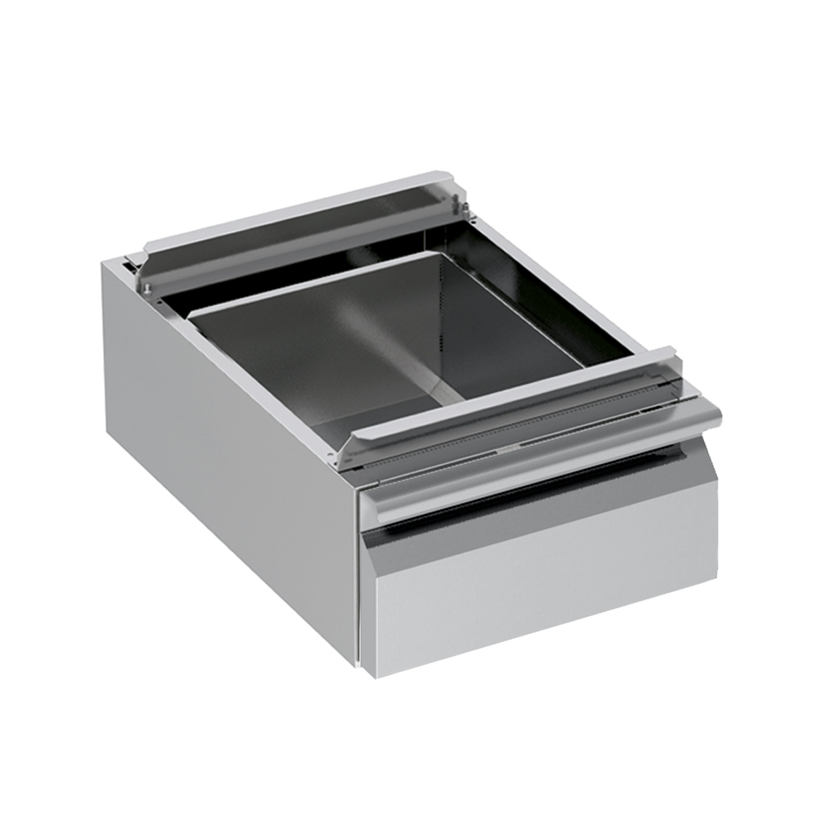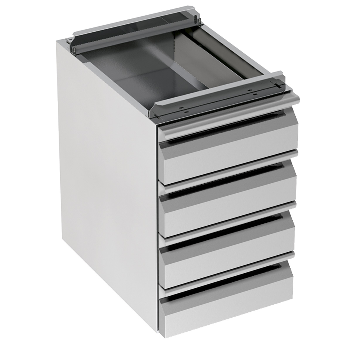 Encimera en acero inox 18-10 satinado.Altura 60 mm Panel de apoyo fonoabsorbente idrófugo y ignífugo. Encimera idónea a soportar pesos max. 150 kg/m² gracias a 4 patas tubulares en acero inox, Ø 50 mm. Encimera redondeada en un frente, espesor 12/10 mm.Peto posterior.